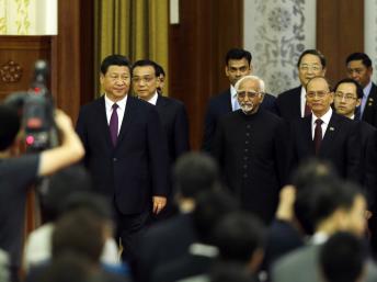Chủ tịch Trung Quốc Tập Cận Bình (trái) cùng Tổng thống Myanmar (phải) và Phó Tổng thống Ấn Độ (giữa) tại Đại lễ đường Nhân dân, Bắc Kinh, ngày 28/6/2014